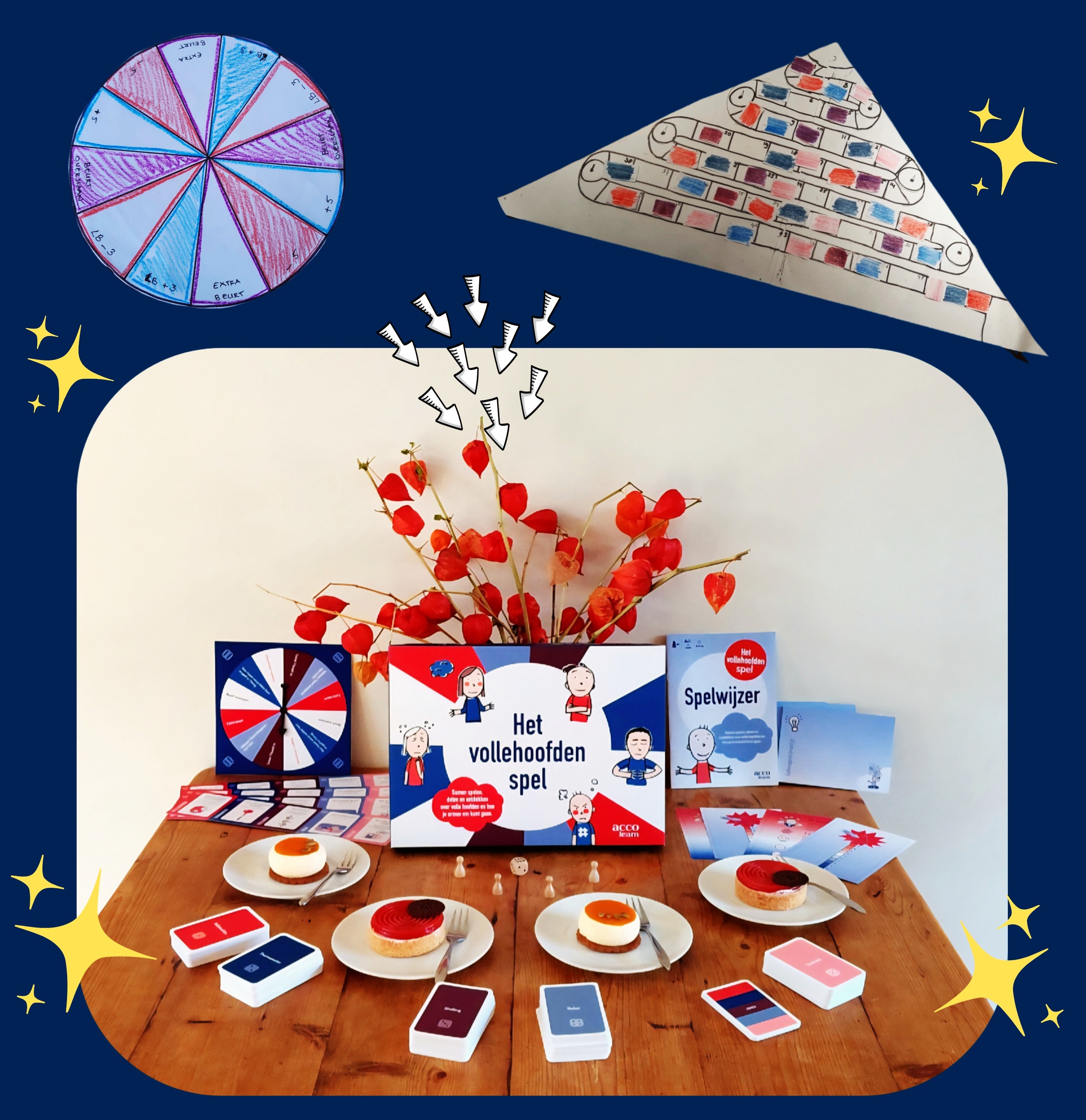 Het Vollehoofdenspel is een psycho-educatief spel. Met dit spel kom je sámen met anderen, al spelend en delend, meer te weten over volle hoofden en wat helpt om ze weer rustig te maken. De verschillende spelonderdelen helpen je te voelen wanneer je hoofd druk wordt, hoe je het kunt herkennen én wat helpt om weer je rust te vinden. De spelleider helpt je onderweg. Samen praat je over dingen die anderen ook meemaken. Zo leer je niet alleen van het spel, maar ook van elkaar!